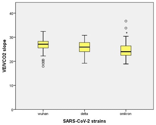 Distribution of the VE/VCO2 slope values within different SARS-CoV-2 strains. * = The mean difference is significant at 0.05.