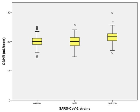 Oxygen consumption at VAT was also much greater in the Omicron group of participants compared to both the Wuhan and Delta groups, which means that the aerobic economy has improved to a great extent during the later stages of the pandemic. Furthermore, athletes infected with the Omicron virus variant had much better ventilatory efficiency and higher O2/HR values than those infected with the Wuhan and Delta strains (Scheme 1 and Figure 6). VE/VCO2 slope values were significantly lower in the later stages of the pandemic, which indicates that the ventilatory requirements for a certain level of effort were reduced. The amount of oxygen delivered to the working muscles with each left ventricular contraction was highest in the Omicron group. The distribution of these data within different groups of SARS-CoV-2 strains is shown in Figure 7 and Figure 8, respectively.