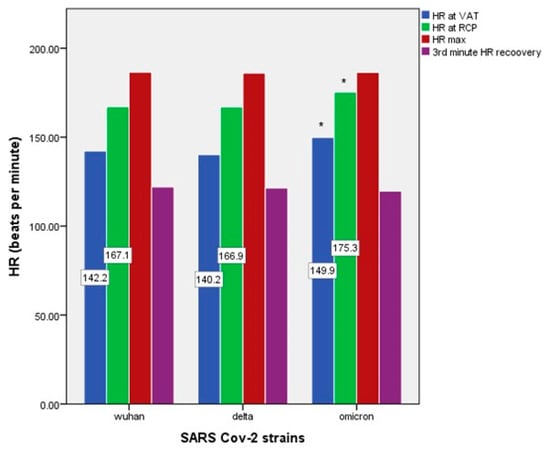 The influence of different SARS-CoV-2 strains on heart rates achieved at different stages of CPET. * = The mean difference is significant at the 0.05 level.