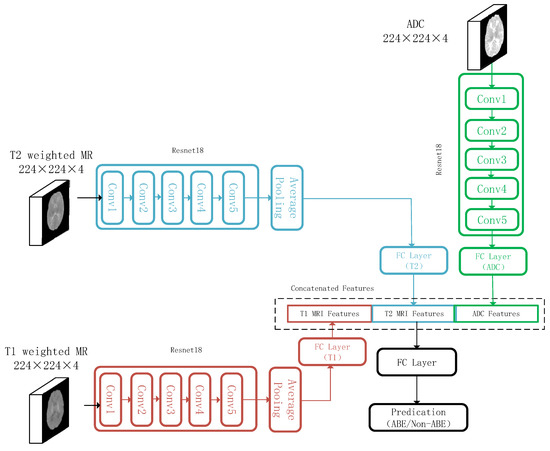 We used ResNet18 as the backbone to build a multimodal image classification network (Figure 2), where ResNet18 was used for image feature extraction [20]. Subsequently, we fused the multimodal features and constructed a fully connected layer to distinguish between ABE and non-ABE patients. We used transfer learning methods to initialize the model parameters effectively and improve the training performance. To counteract the issues of limited training subjects and overfitting during the training process, we used data augmentation methods, including randomly translating images horizontally and vertically by −60 to 60 pixels, rotating images by −60 to +60 degrees, and scaling images 0.8 to 1.2 times.