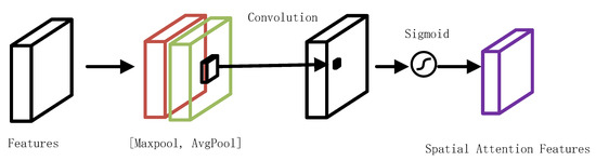 Diagram of the spatial attention module. The spatial attention module separately calculated the maximum pooling output and the average pooling output along the channel axis. These results were then concatenated and passed through a convolutional layer and sigmoid activation function to obtain the spatial attention features.