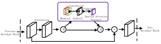 Diagram of the spatial attention module integrated with a residual block in ResNet18. The diagram shows the specific connection position of the spatial attention module in the residual block of ResNet18.