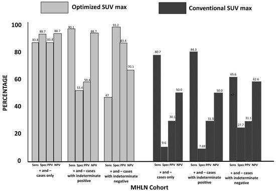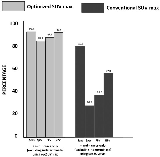 The results of optSUVmax and conSUVmax classified as indeterminate were further analyzed. Their effects on sensitivity, specificity, PPV, and NPV when grouped with positive or negative findings are shown in Figure 1.