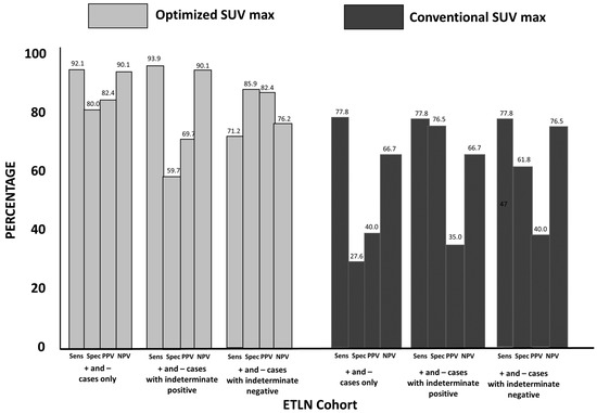 Extra-Thoracic Lymph Node (ETLN) Cohort Statistical Findings for OptSUVmax vs. ConSUVmax (see description in Figure 1): The sensitivity for optSUVmax vs. conSUVmax was 92.1% vs. 77.8%, respectively (p = 0.043). The specificity for optSUVmax vs. conSUVmax was 80.1% vs. 27.6%, respectively (p < 0.0001). The optSUVmax vs. conSUVmax accuracy was 87% vs. 46.8%, respectively (p < 0.0001). When optSUVmax indeterminate findings were grouped with positive for malignancy, specificity declined, indicating a greater risk for false-positive interpretation.