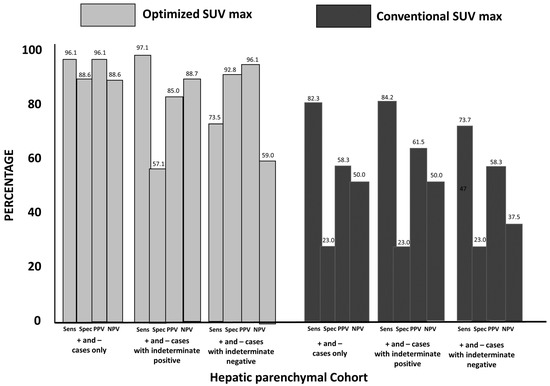 Hepatic Parenchymal Cohort Statistical Findings for OptSUVmax vs. ConSUVmax (see description in Figure 1): optSUVmax sensitivity and specificity were 96.1% and 88.8%, respectively, with a PPV of 96.1% and an NPV of 88.8% for positive or negative FDG PET-CT determinations relating to hepatic metastases. The sensitivity, specificity, PPV, and NPV for conSUVmax were 82.3%, 23.0%, 55.3%, and 50.0%, respectively, for positive and negative cases. When indeterminate cases were grouped as positive or negative, the results with optSUVmax were superior compared to conSUVmax determinations.