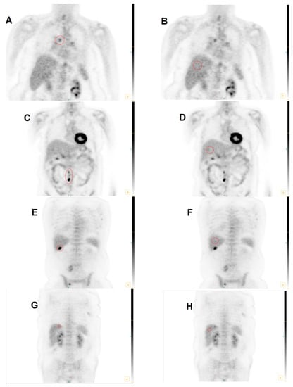 - Ramos, C.D.; Erdi, Y.E.; Gonen, M.; Riedel, E.; Yeung, H.W.D.; Macapinlac, H.A.; Chisin, R.; Larson, S.M. FDG-PET standardized uptake values in normal anatomical structures using iterative reconstruction segmented attenuation correction and filtered back-projection. Eur. J. Nucl. Med. 2001, 28, 155–164. [Google Scholar] [CrossRef]