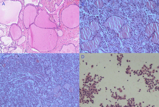 - Dobi, A.; Kim, S.A.; Zhang, M.; Iames, E.; Lamzabi, I. Highly differentiated follicular carcinoma of ovary: Use of imprint cytology at intraoperative consultation. Diagn. Cytopathol. 2020, 48, 360–363. [Google Scholar] [CrossRef]