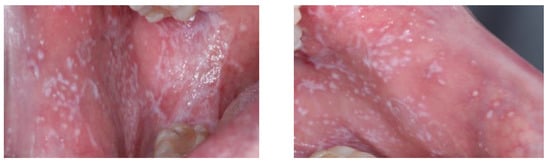 Statistical analysis was done using R (R Development Core Team, version 4.1.3), and the information was recorded in an Excel file. Initially, we conducted a descriptive study of all of the variables. First, mean age was considered and subsequently split into two categories, selecting 60 years and under or over 60 years as break points. The predominant clinical form was classified as non-atrophic-erosive or atrophic-erosive (Figure 1 and Figure 2). The location of OLP was recorded as two locations or three or more locations. The ADA prediabetes, WHO prediabetes, WHO diabetes variables and medication were recorded as either present or absent. We added the variable type of treatment and recorded whether treatment was insulin-dependent or used antidiabetic drugs. Student’s t-test was used to compare the numerical variables between the two groups. The relationships between qualitative variables were assessed by Pearson’s chi-square test. The relationships were quantified by crude ratios and a multivariate logistic regression model produced using stepwise selection with variables whose p value was <0.20 in the univariate analysis and by age and sex. Results were considered statistically significant when p < 0.05.