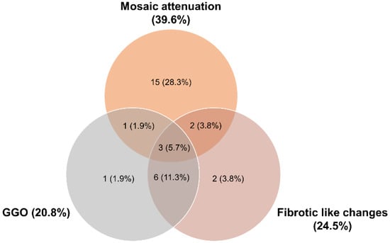 Prevalence of the most dominant chest CT findings (mosaic attenuation, ground glass opacities (GGOs), and fibrotic-like changes) in a Venn diagram.