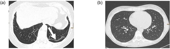 Two examples of chest CT scans. (a) CT examination in supine position of a 62 year old female patient with post-COVID-19 syndrome. The lung parenchyma shows subpleural bands (arrow) in the left lower lobe as sign of residual post-COVID changes. (b) CT examination in prone position of a 32 year old female patient with post-COVID-19 syndrome. The lung parenchyma is unremarkable.