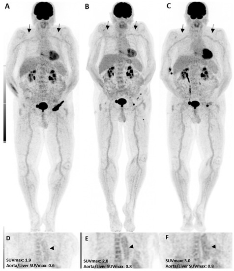 A patient with the diagnosis of melanoma with ongoing immune checkpoint inhibitors treatment without a history of cardiovascular diseases or clinical evidence of vasculitis. [18F]FDG PET/CT maximum intensity projections (B,C), as well as coronal (E,F) views, three and six months after treatment initiation, are shown. The mild increase in uptake intensity of the aorta and subclavian arterial walls was visually seen compared to the pretreatment (A,D, arrows) images. Semi-quantitative analyses by SUVmax were correlated with visual findings showing a mild increasing pattern of [18F]FDG uptake suggestive of immunotherapy-related mild arterial wall inflammation.