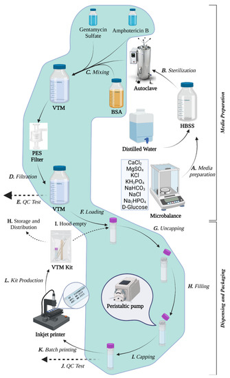 VTM was prepared using modified US-CDC standard operating procedure (SOP) DSR-052-05 [22] with Hank’s balanced salt solution (HBSS) (as a balanced salt solution). In this step, the mixture was sterilized by autoclaving at 121 °C for 30 min. In total, 0.5 µg/mL of gentamicin sulfate (CAS number: 1405-41-0, Merck KGaA, Darmstadt, Germany) was used as an antibacterial. Instead of recommended amphotericin B as an antifungal, 100 µg/mL fluconazole (CAS No.: 86386-73-4) was used as both possess fungicidal properties [23]. Gentamycin sulfate was dissolved in distilled water (dH2O) and fluconazole in dimethyl sulfoxide (DMSO) (CAS number: 67-68-5, Merck KGaA, Darmstadt, Germany) before combining it with the HBSS solution. Instead of recommended 2% fetal bovine serum (FBS) as a growth supplement, 1% bovine serum albumin V (BSA, BioFroxx, neoLab Migge GmbH, Rischerstr. 7–9, D-69123 Heidelberg, Germany) was used as BSA is advantageous over FBS [24]. Finally, the finished VTM was filtered through a polyethersulfone (PES) liquid filter (pore size 0.2 µm; Sartorius Stedim Biotech, Göttingen, Germany). All preparation steps were performed in a sterile biosafety cabinet to ensure the sterility of the final product (Figure 1). Biosafety cabinets were thoroughly wiped with 70% ethanol and UV irradiated before and after use. Before dispensing, VTM from each batch was aseptically sampled for quality control (QC) testing.