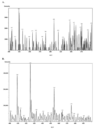 LC-MS scan of VTM. LC-MS scan of VTM for fluconazole (A) and gentamicin sulfate (B) identification.