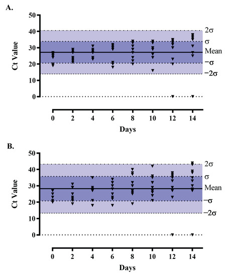 Extent of SARS-CoV-2 RNA detection over 14 days. Ct values of N gene (A) and ORF gene (B) amplification from the delayed nucleic acid amplification test (NAAT) plotted in the Levey-Jennings plot. The test days with more than one data point represent the same batch of VTM evaluated for multiple samples. Other than two specimens, deviation in Ct values for both viral RNA and control gene amplification was within the limit of variation, i.e., 2σ.