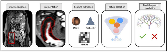 In the field of oncology, radiomics has gained notable traction. For instance, authors trained and validated a radiomics-driven machine learning (ML) model to predict the histopathologic response to neoadjuvant chemoradiation using baseline T2-MRI images of primary rectal cancers [4]. Recently, clinical uses of radiomics in Crohn’s disease (CD) have started to be investigated. Using this advanced technique to improve intestine segmentation techniques for cross-sectional imaging has the potential to reduce variability and improve disease activity measures. For example, radiologists could benefit from automation to score staging more objectively, quantify bowel features, and reduce interobserver variability. In IBD, radiomics represent a promising tool that could assist radiologists in better assessing disease severity, clinical decision-making, and patient phenotyping. Indeed, through texture analysis, numerous quantitative pieces of information may be retrieved from radiological scans and placed into machine learning models to predict desired outcomes [5]. Radiomics has proven to be a useful technique in the gastrointestinal field, allowing radiologists to be more accurate in predicting gene signatures [6], diagnosing rectal cancer, colon, small bowel, and other lesions [7,8,9], detecting fibrosis in paediatric CD patients [10], and evaluating treatment response [7,11]. However, only a few studies have focused on CD diagnosis [12]. In this context, the researchers focused primarily on how radiomics could aid in CD diagnosis [13], evaluation of therapeutic response [14,15], and severity of disease and its complications [16,17,18].