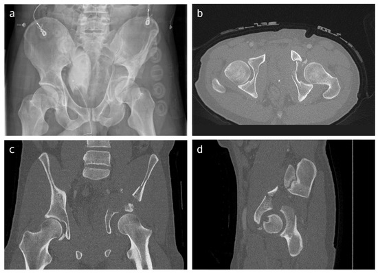 Conventional imaging provided within the surveys: (a) pelvic radiograph (AP overview), (b–d) examples of the axial, coronal, and sagittal CT slice (surgeons could scroll through every slice of the CT scan).