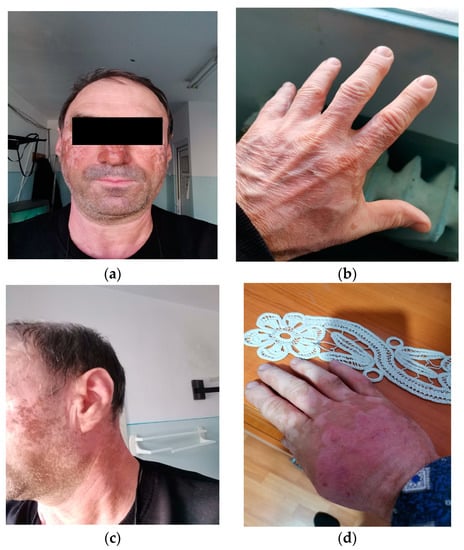 Vitiligo-like lesions in the areas exposed to the sun: (a) face and forehead; (b) dorsal side of the left hand; (c) face, forehead and left side of the neck; (d) dorsal side of the right hand.