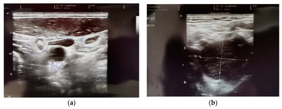 (a) Two nodular images, with the hyperechoic center of 0.66 and, respectively, 0.53 cm, between external to common carotid artery (CCA) and internal jugular vein (IJV). (b) Hypoechoic nodular image, with Doppler signal in the hilum, the transverse diameter of 2.57/2.42 cm; longitudinal diameter of 4.54/2.14 cm, between internal carotid artery (ICA) and external carotid artery (ECA), in direct contact with the vessels.—April 2021.