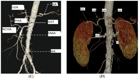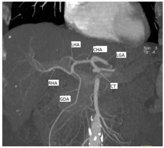 - Malviya, K.K.; Verma, A.; Nayak, A.K.; Mishra, A.; More, R.S. Unraveling Variations in Celiac Trunk and Hepatic Artery by CT Angiography to Aid in Surgeries of Upper Abdominal Region. Diagnostics 2021, 11, 2262. [Google Scholar] [CrossRef] [PubMed]