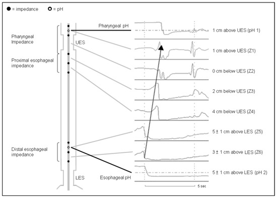 An example of pharyngeal acid reflux episodes detected by 24 h ambulatory hypopharyngeal multichannel intraluminal impedance-pH test. The mixed gas–liquid refluxate can be tracked from the distal esophagus along the entire esophagus to the hypopharynx [54]. The arrow indicates retrograde changes of pH and impedence levels.