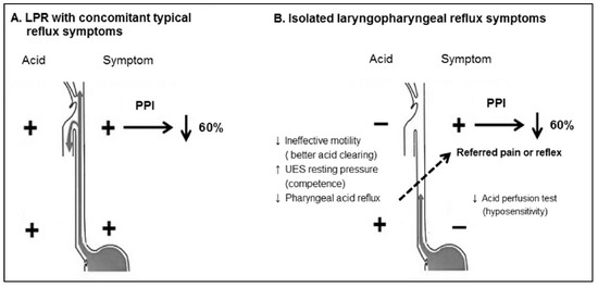 (A) In patients with suspected LPR and concomitant typical reflux symptoms, the pre-testing probability of a positive pH is high; thus, a positive composite pH may not predict laryngeal symptom response to PPI therapy. It is likely that factors other than reflux may also contribute to the laryngeal symptoms. (B) In patients with suspected isolated LPR symptoms, the pre-testing probability of a positive composite pH is low. Thus, a positive composite pH may predict laryngeal symptom response to PPI therapy and acid is likely the cause of the laryngeal symptoms [40]. LPR, laryngopharyngeal reflux; PPI, proton pump inhibitors.
