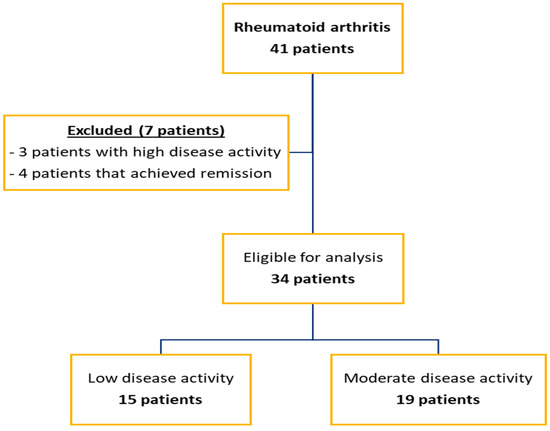 This study included 41 consecutive patients diagnosed with RA, according to the American College of Rheumatology/European League Against Rheumatism (ACR/EULAR) 2010 classification criteria [43], based on history, clinical examination, serological parameters, and imaging investigations performed in the Rheumatology Clinic, Emergency County Clinical Hospital of Craiova.