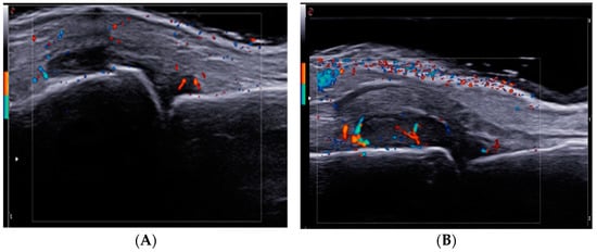 The US examination used the US 7 joints score, proposed by Backhaus et al., which includes the evaluation of the most clinically involved joints of the hand and foot: wrist, metacarpophalangeal (MCP) II and III, proximal interphalangeal (PIP) II and III, and metatarsophalangeal (MTP) II and V. These joints were evaluated for synovitis, tenosynovitis, and superficial bone erosions. Synovitis was scored on a 0–3 scale in both grayscale (GS) and PD ultrasound modes, while erosions and tenosynovitis were recorded as present (1) or absent (0). The semiquantitative assessment of synovitis was based on the EULAR/outcome measures in rheumatology (OMERACT) scoring system [48]. GS synovitis was scored as follows: (0) None = no synovial hypertrophy (SH) or effusion; (1) Minimal = SH with or without effusion up to the level of bone surfaces; (2) Moderate = SH with or without effusion extending beyond the joint line; (3) Severe = SH with or without effusion extending beyond the joint line with convex surface and distension of joint capsule. PD synovitis was scored as follows: (0) None = no Doppler signal; (1) Minimal = up to 3 single Doppler spots or one confluent spot; (2) Moderate = greater than grade 1, but <50% of joint displays Doppler signal; (3) Severe = greater than grade 2, with >50% of the joint showing Doppler signal. The scoring range was 0–27 for GS synovitis, 0–39 for PD synovitis, 0–7 for GS tenosynovitis, 0–21 for PD tenosynovitis, and 0–14 for erosions [49,50].