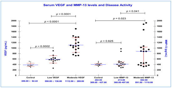 Serum concentrations of VEGF (pg/mL), MMP-13 (pg/mL) and disease activity, based on DAS28(4v) CRP vs. controls; black circles represent serum concentrations of VEGF and MMP-13 from individual serum samples; blue horizontal lines represent mean (VEGF) and median (MMP-13) values, accompanied by standard deviation (VEGF) and interquartile range (MMP-13) represented by red horizontal lines.