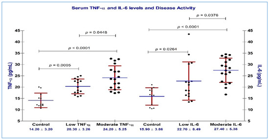 Serum concentrations of TNF-α (pg/mL) and IL-6 (pg/mL) and disease activity, based on DAS28(4v) CRP vs. controls; black circles represent serum concentrations of TNF-α and IL-6 from individual serum samples; blue horizontal lines represent mean values, accompanied by standard deviation represented by red horizontal lines.