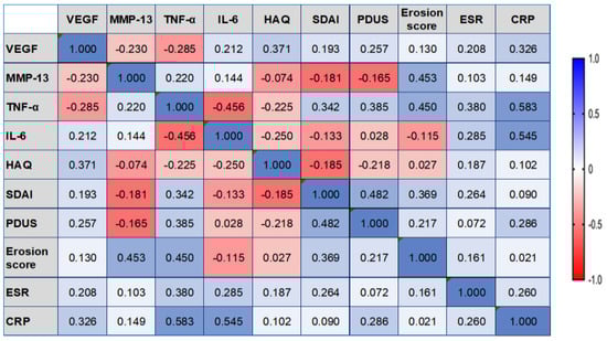 The correlation heatmap between measured indicators (colors range from bright blue for strong positive correlations to bright red for strong negative correlations), in L group. VEGF: vascular endothelial growth factor; MMP-13: matrix metalloproteinase 13; TNF-α: tumor necrosis factor-alpha; IL-6: interleukin 6; HAQ: Health Assessment Questionnaire; SDAI: Simplified Disease Activity Index; PDUS: power Doppler (PD) ultrasound (US); ESR: erythrocytes sedimentation rate; CRP: C-reactive protein.