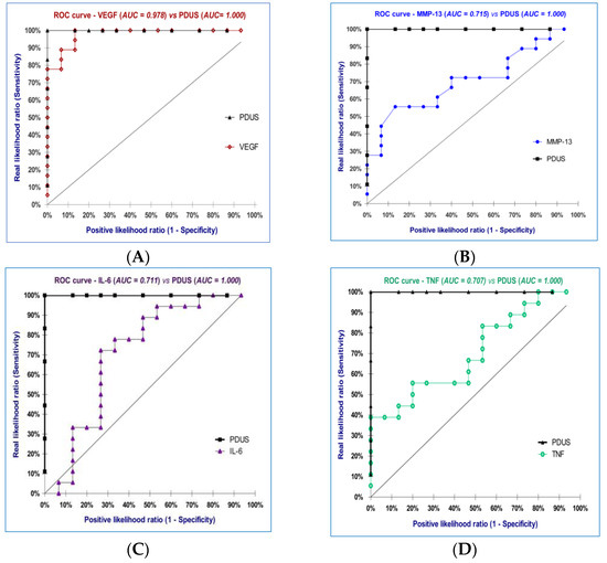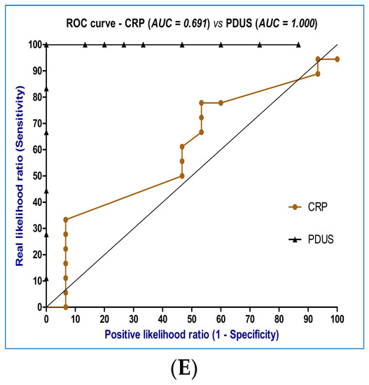 A final objective of this study was to determine and compare Sn and Sp of MMP-13, VEGF, TNF-α, IL-6, with CRP, PDUS, and DAS28(4v) CRP, along with LR (+) and LR (−), which could provide a precise differentiation for patients with moderate disease activity. By comparing the ROC curves for the seven parameters analyzed (Table 4), we can observe that the best differentiation of patients with moderate disease activity of RA can be obtained using PDUS (100.00% accuracy), followed by VEGF (97.80% accuracy), MMP-13 (71.50% accuracy), and IL-6 (71.10% accuracy). Therefore, we refer to the diagnostic performance of the PDUS measurements when we analyze the predictive utility of the markers investigated (Figure 7A–E).