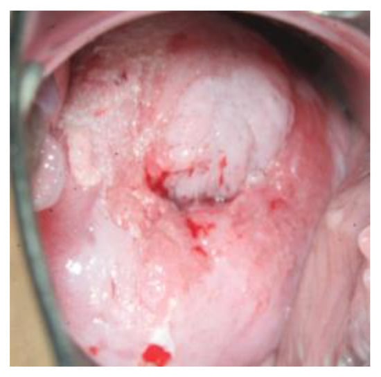 The high-risk HPV types 16 and 18 are responsible for 70% of HPV-induced cervical cancers and their preliminary stages or cervical intraepithelial neoplasia (CIN) []. The interval between an infection with an HP virus and the emergence of invasive cervical cancer is about 10 years []. After acetic acid staining, changes in the cervix on colposcopy are graded as minor or major (these may have a mosaic or dotted pattern) and should be investigated by performing a biopsy (Figure 3) []. This is usually done in the course of a so-called investigative colposcopy, which follows after an unusual PAP smear report and/or in case of a persistent HPV infection, as part of secondary prevention of cervical cancer [].