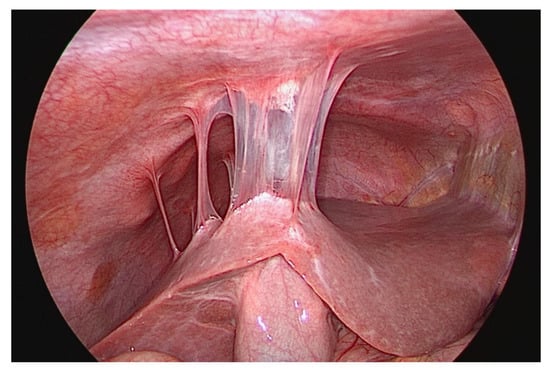 Fibrinous adhesions between the peritoneum and the liver surface (Fitz-Hugh–Curtis syndrome) [].