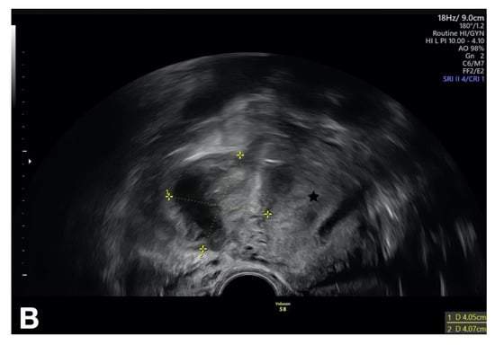 Vaginal ultrasound investigation showing the tubo-ovarian abscess in the right-sided adnexa. The uterus is marked with a star [].