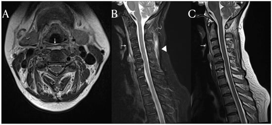 Cervical spine MRI. In the T2-weighted sagittal image, mild edema and high signal changes in the prevertebral soft tissue (arrow) are found (A–C). Notably, on the fat suppression T2-weighted image, additional findings of high signal intensity in the posterior neck fascia (arrowhead) are observed (B).