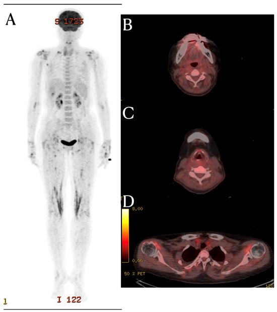 FDG PET-CT finding. Bilateral shoulder shows uneven FDG uptake (D). Both wrists, hips, and knees show increased FDG uptake (A). However, in the FDG PET-CT images of the C3 (B) and C5 spinal level (C), there is no hot uptake in the prevertebral soft tissue and posterior neck fascia areas, where signal changes were seen in the MRI.