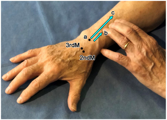 The landmarks used for palpation were the second and third metacarpal bases (2ndM, 3rdM), where extensor carpi radialis longus and extensor carpi radialis brevis are inserted. a, dorsal tubercle of the radius of radius; b, ulnar edge of extensor pollicis brevis; c, radial edge of abductor pollicis longus. Blue arrows indicate the distances between the dorsal tubercle of the radius and the ulnar and radial borders of the 1st compartment muscles.