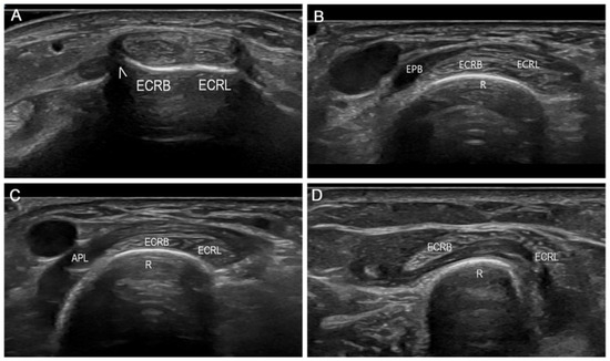 Ultrasound scanning of the second dorsal compartment tendons and the first dorsal compartment muscles, short-axis view. (A) Extensor carpi radialis brevis (ECRB) and extensor carpi radialis longus (ECRL) at distal dorsal tubercle of the radius level (arrowhead). (B) Crossing between the second dorsal compartment tendons (ECRB, ECRL) and the extensor pollicis brevis (EPB) muscle. R, radius. (C) Crossing between the second dorsal compartment tendons (ECRB, ECRL) and the abductor pollicis longus (APL) muscle. R, radius. (D) Musculotendinous junction of the ECRB and ECRL. R, radius.