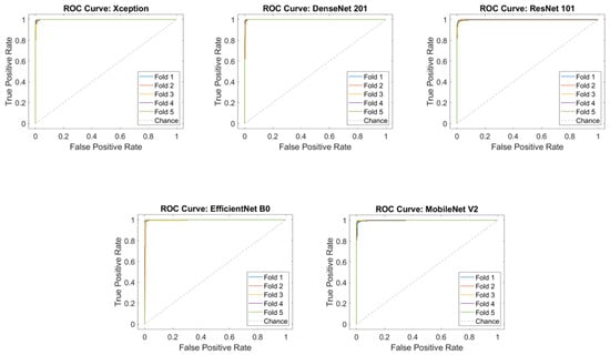 The evaluation and comparison of model performance using a five-fold cross-validation approach has revealed significant findings: the DenseNet-201achieved superior results in terms of accuracy, sensitivity, NPV, MCC, F1-Score, and Cohen’s Kappa is 0.9914691, 0.9952845, 0.9958081, 0.99102, 0.98302 and 0.98289, respectively. In terms of specificity and AUC, Xception achieved the best results with 0.990890819 and 0.999481, respectively. EfficientNet-b0 achieved the best result in terms of PPV with 0.9901014. This shows that DenseNet-201 achieved the best result, followed by Xception, as shown in Table 6.