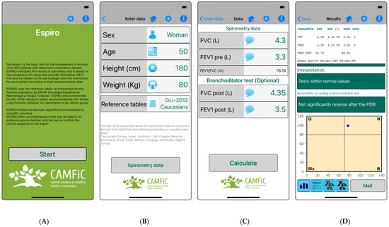 Members of the CAMFIC respiratory disease group developed the software, which has been available for the Android (Play Store) and iOS (App Store) operating systems since February 2016 (the version currently available is 1.6). It supports five different languages (Catalan, Spanish, English, French, and Portuguese). At first, the app asks for anthropometric data (sex, age, height, and weight), as well as the selection of a reference table from GLI-2012 (Global Lung Function Initiative) that covers a wide age range in different ethnic groups [13]. Secondly, the spirometric data (forced vital capacity (FVC) and forced expiratory value in the first second (FEV1)) obtained in basal and postbronchodilator spirometry must be introduced. Finally, the Espiro app generates a report based on a comparison of the theoretical values and the anthropometric data using a previously validated algorithm adapted to the American Thoracic Society/European Respiratory Society (ATS/ERS) spirometry recommendations [14]. The report indicates the functional pattern (normal, obstructive, spirometric restriction, or mixed), severity (mild, moderate, moderately severe, severe, and very severe), and the result of the reversibility test, commonly called the bronchodilation test (negative without changes, significant reversibility, and non-significant reversibility).