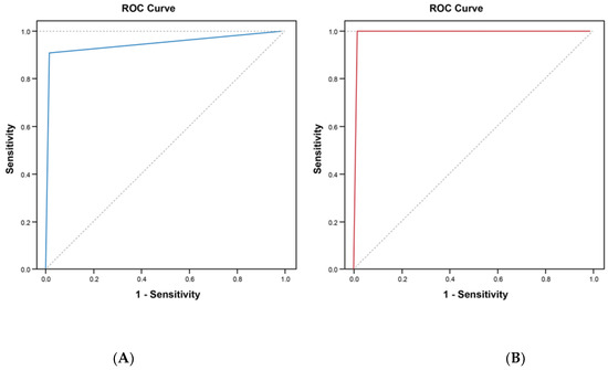 ROC (receiver operating characteristic) curve of the Espiro app to predict the diagnosis of each pulmonologist. (A) Area under the curve for pulmonologist 1: 0.947 (95% confidence interval: 0.894–1.000); (B) area under the curve for pulmonologist 2: 1.000.