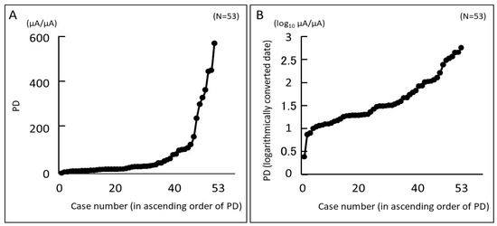 Figure 1A shows a graph of the PD of the 53 cases included in this study, sorted from least painful to most painful. PD increased exponentially according to the Weber–Fechner law [33,34]. Figure 1B is a log-transformed graph of Figure 1A. The base of the logarithm was set to 10. Log-transformed PD increased linearly for all subjects. The median PD for the 53 subjects was 30.6 µA/µA (interquartile range, 16.9 to 93.2). When log-transformed with the base of the logarithm as 10, the median PD was 1.49 (interquartile range, 1.23 to 1.97).