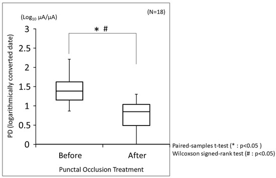 Box-and-whisker plot of minimum to maximum EP evaluated using PainVision®. The evaluated EP is expressed by the PD index, and the logarithmic conversion of PD is shown in this figure. The base of the logarithm is 10. The box contains the lower quartile, the median, and the upper quartile before and after punctal occlusion treatment, and the minimum and maximum values are indicated by vertical bars. The paired-samples t-test and the Wilcoxon signed-rank test were used for statistical analysis, and a p-value of <0.05 was considered statistically significant.