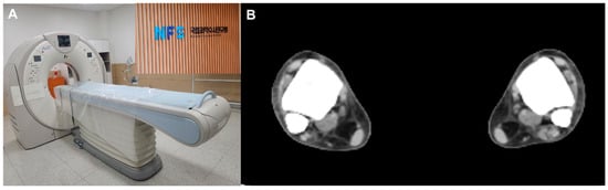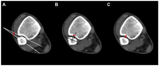 On arrival at NFC, all subjects were screened with bilateral ankle CTs (Aquilion PRIME TSX-303A, CANON Medical Systems Corporation, Tokyo, Japan) (Figure 1A). To provide consistent axial slices parallel to the plafond, the vertical axis of the tibia and the horizontal axis of the plafond were used as reference axes. In addition, the bimalleolar axis, a line perpendicular to the line connecting anterior aspects of the medial and lateral malleoli, was used as a reference to guarantee neutral rotation [,]. For each CT scan, a single axial image 1 cm above the tibial plafond, a level where the length of the distal anterior tibial tubercle is the greatest, was selected for measurement [] (Figure 1B).