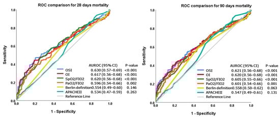 Comparison of ROC curves of six commonly used predictors of ARDS mortality. AUROCs of OSI were the highest for mortality at 28 days or 90 days.