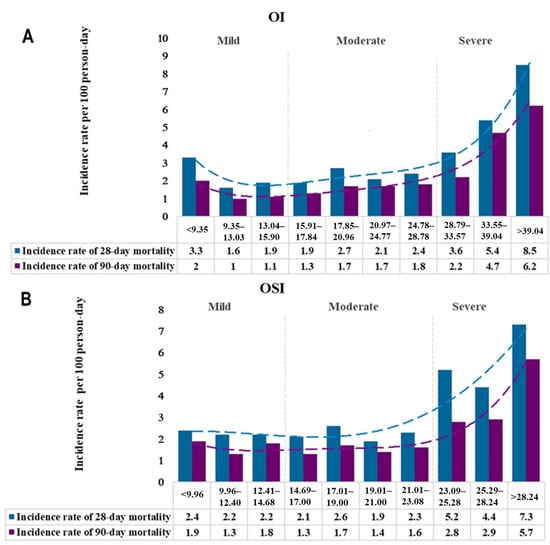 Incidence rate of mortality per 100-person-day stratified by the 10th percentiles of OI (A) and OSI (B). ARDS were classified into 3 groups: mild (OI < 15.91, or OSI < 14.69), moderate (15.91 < OI < 28.78 or 14.69 < OSI < 23.08) and severe (OI > 28.78, or OSI > 23.08).
