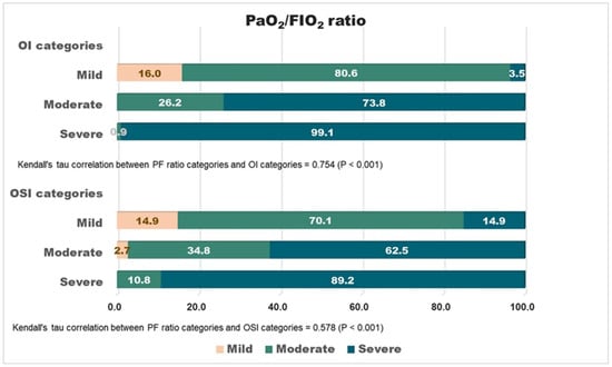 OI or OSI-based categorization was highly correlated with PaO2/FIO2 ratio categorization by a Kendall’s tau of 0.754 (p < 0.001) (for the OI) or 0.578 (p < 0.001) (for the OSI) (Figure 3).