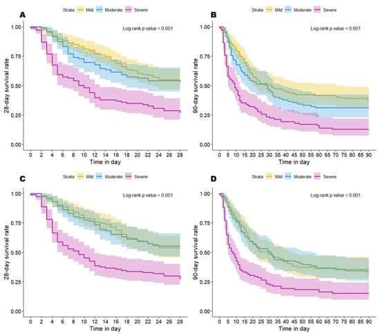 The Kaplan–Meier curves of ARDS patients with various OI or OSI-based severity categories were significantly different for 28-day or 90-day mortality. All of these log-rank p-values were less than 0.001 (Figure 4). The mortality rate for each OI- or OSI-based severity category is presented in Table S1.