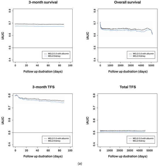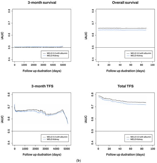 The predictive efficacy between the two MELD-based scoring systems within subgroups was evaluated. When compared by sex, both MELD-based scores showed the highest predictive accuracy for 3-month TFS, followed by overall TFS, 3-month survival, and overall survival, in both males and females. In the comparison between the two scoring systems, MELD 3.0 with albumin demonstrated superior values to MELD-Na-KT in all categories, including 3-month survival, overall survival, 3-month transplant-free survival (TFS), and overall TFS, for males and females (Table 2). Nevertheless, the 3-month survival value for males did not have statistical significance in the comparison. In addition, we also conducted a comparison of the time-dependent iAUC by sex. In males, the MELD 3.0 with albumin showed a higher iAUC value when predicting 3-month survival, TFS, and overall TFS at all time points. However, MELD-Na-KT demonstrated a higher iAUC value when predicting overall survival. In females, the MELD 3.0 with albumin showed higher iAUC values in all categories.