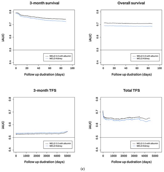 Next, we analyzed whether there was a difference in predictive efficacy between MELD 3.0 and MELD-Na-KT based on the type of kidney dysfunction (Table 3). Both MELD-based scores had the highest predictive accuracy for 3-month TFS, followed by overall TFS, 3-month survival, and overall survival, in all kidney dysfunction types. In the comparison between the two scoring systems, MELD 3.0 with albumin demonstrated superior performance over MELD-Na-KT in 3-month survival and overall survival across all kidney dysfunction types. However, the compared values for overall survival in the AKD and CKD groups did not reach statistical significance. The compared value for 3-month TFS and overall TFS in the normal, AKD, and AKD on CKD groups did not show statistical significance. Only values compared in the CKD group showed significance, and MELD 3.0 with albumin had higher predictive power than MELD-Na-KT. We conducted a comparison of the time-dependent iAUC for the two MELD scoring systems based on the kidney dysfunction type. First, in the group with normal kidney function, MELD 3.0 with albumin showed a higher iAUC value in 3-month and overall survival, while showing similar values for 3-month and overall TFS. In the AKD group, MELD 3.0 with albumin showed a higher iAUC value for 3-month and overall survival, but lower in 3-month and overall TFS. In the CKD group, MELD 3.0 with albumin had a higher iAUC value in 3-month survival and TFS, while showing similar values in overall survival and TFS. Lastly, in the AKD on CKD group, MELD 3.0 with albumin demonstrated a higher iAUC value for overall TFS, while showing similar values in 3-month survival and TFS, but lower in overall survival.